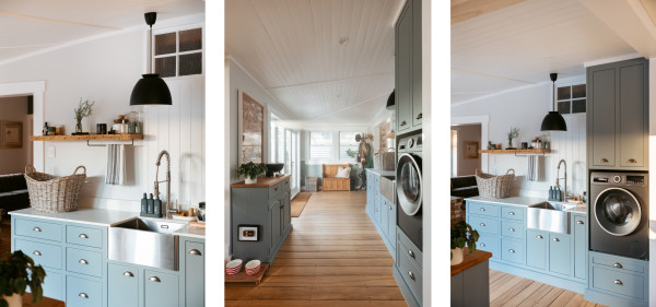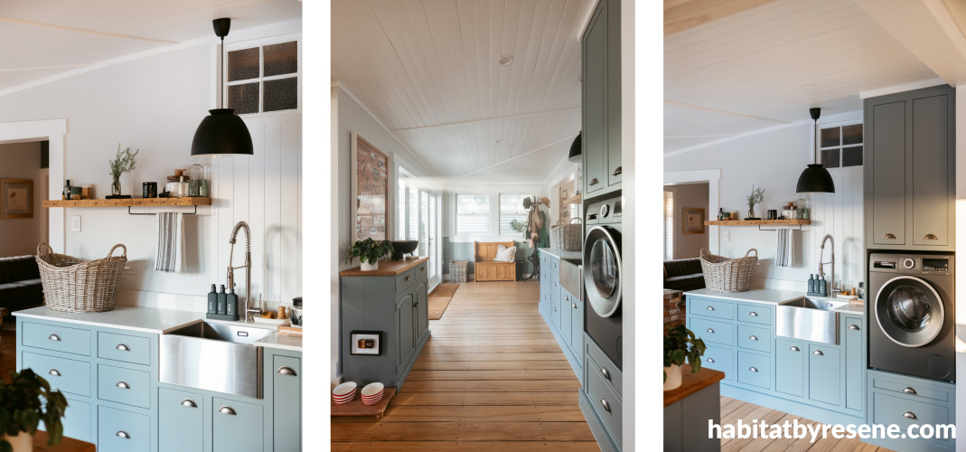 Laundry cabinetry in Resene Rolling Stone, walls in Sea Fog and ceiling and trims in Alabaster.