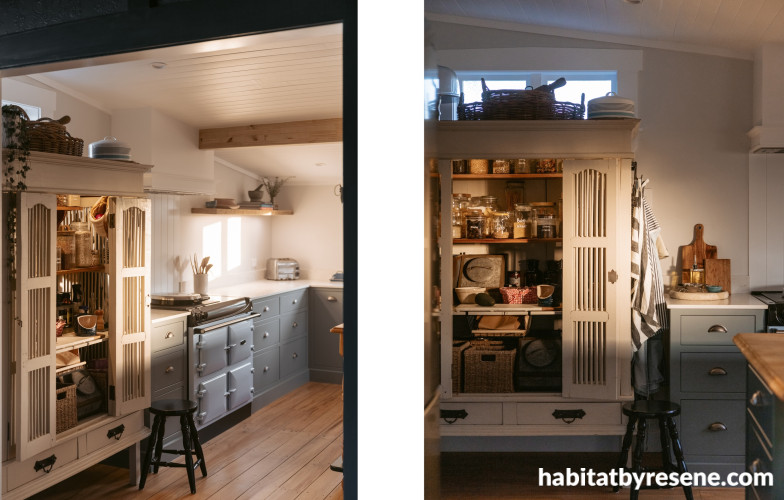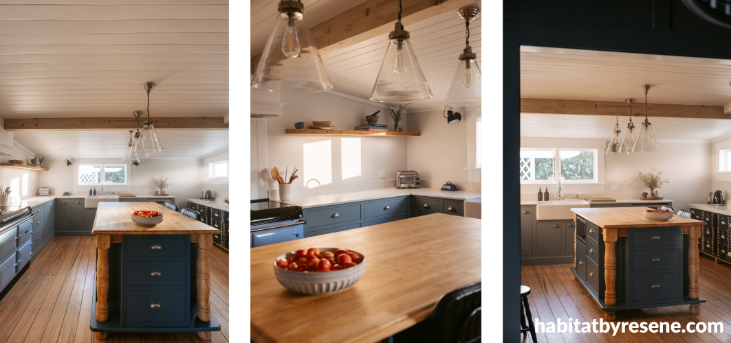 Resene Big Stone is used on the kitchen island and in the dining room, adding contrast and anchoring the lighter elements. Paired with timber surfaces and open shelving, it introduces depth without losing warmth. The combination of painted cabinetry and natural materials keeps the space balanced, cosy and inviting.