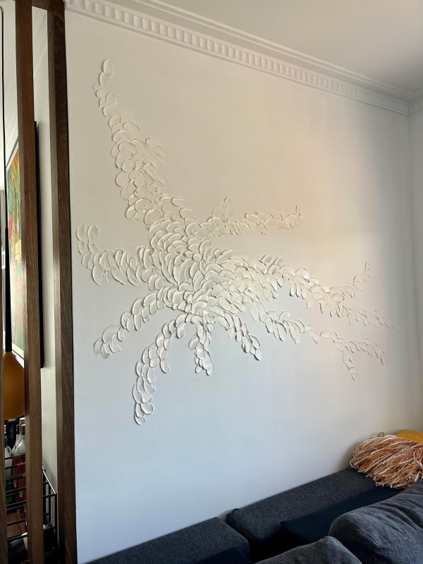 “Take the sculptural artwork in the lounge room for example, it serves to create texture and movement without overpowering the space. It’s all hand-applied and finished with a semi-gloss paint, which against the low sheen of the wall, allows the reflected light to be as important as the texture.”