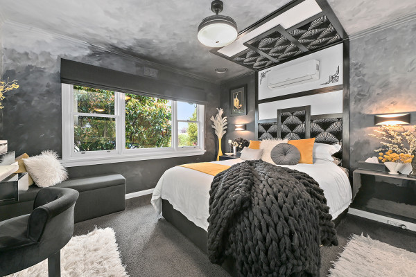 Texture was the order of the day for the main bedroom, which features a dramatic gradient effect on the walls and ceiling using Resene All Black, Alabaster, Cliff Face Grey, Amber Grey and Athens Grey. Being private, personal spaces, bedrooms allow you to have a bit more fun with the style, says Sandra.