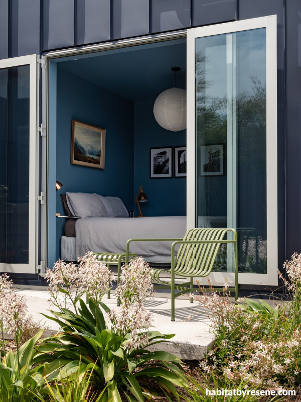 On the exterior, natural tones are balanced with strength and character. The blockwork is painted in Resene Half Black White sitting beneath dark cladding in a deep royal blue, all grounded by handmade terracotta tiles.