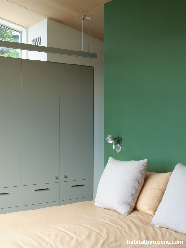 The master bedroom features the striking green of Resene Ranger, complemented by the muted cabinetry in Resene Half Taupe Grey, surrounding walls in Resene Sea Fog and play ceiling finished in Resene Aquaclear.