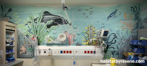 Dannika’s beautiful murals now take centre stage as a distraction from the daunting hospital equipment in calming shades like Resene Home Run, Fringy Flower, Paradise, Onahau, Glorious, Princess and Azure.