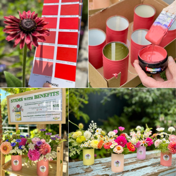 For every can of blooms sold, a can of food is donated to the Christchurch City Mission. Stems with Benefits cans of blooms are sold as a weekly pop-up stand in neighbourhood spaces like markets, cafés and community spaces such as Vic’s Café and Flow Yoga Studios, as well as online for larger, delivered cans of blooms, which in turn donate more cans of food.