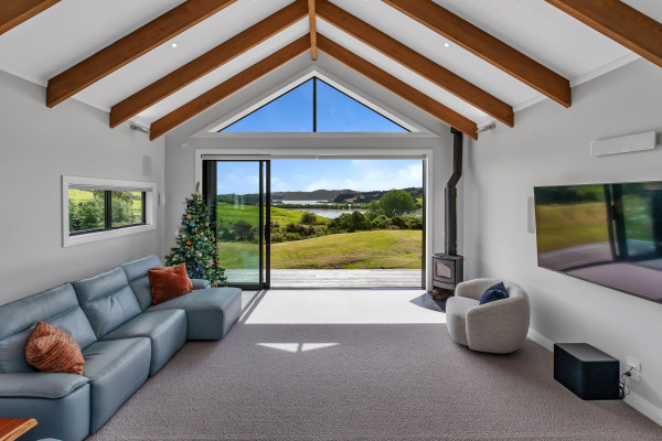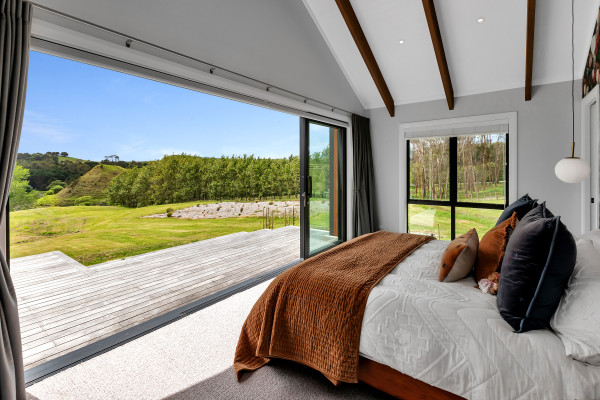 An incredible view to wake up to from the master bedroom, framed by walls in Resene Athens Grey and trims and ceiling in Resene Double Alabaster.