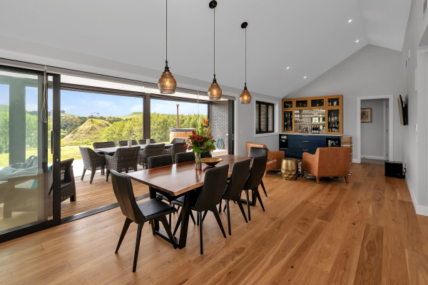 The dining room and bar walls are painted in Resene Athens Grey, a cool, pearly hue, with contrasting trims and ceiling in Resene Double Alabaster. The warm timber floor grounds this space while effortlessly connecting it to the outdoor deck.