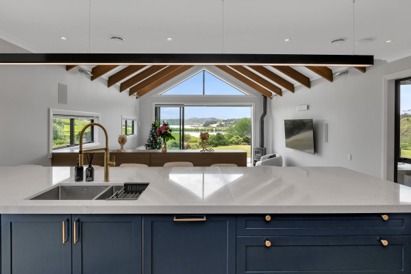 Even the kitchen has a front seat view to the surrounding landscape. The walls are painted in Resene Athens Grey with ceiling and trims in Resene Double Alabaster. For a bold blue in your kitchen like this, use Resene Coast.