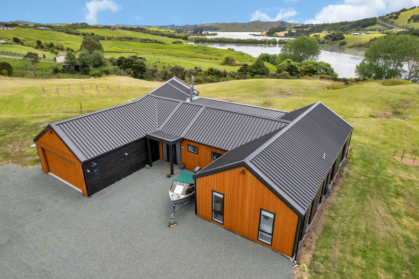 Designed by architectural and interior designer Dasha Tarasova of DDA Consultants, this house sits overlooking picture perfect rolling hills, as well as a freshwater lake on one side and the Kaipara Harbour on the other.