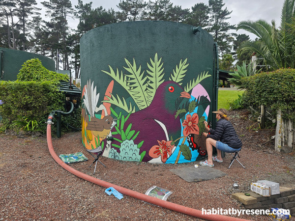 Artist Brooke Wyn (@bwyn_art) transformed a water tank in Kaukapakapa into a colour-filled mural using Resene paint, celebrating native flora and fauna. “I wanted the mural to blend into the bush and planting around the property,” says Brooke. She chose Resene paint for its trusted reputation and wide colour range, making it easy to bring her vision to life. “The paint is vibrant, smooth to apply and great quality. I know it’ll last in the outdoor elements.” Brooke used a range of greens such as Resene Chateau Green, Resene Bilbao, Resene Coriander, Resene Turtle Green and Resene Clover along with pops of other colours to suit her mural, such as Resene Bullwhip, Resene Energy Yellow, Resene Albescent White, Resene Aquarius, Resene Apple Blossom, Resene Double Friar Greystone, Resene West Coast, Resene Brown Derby and Resene Fandango.
