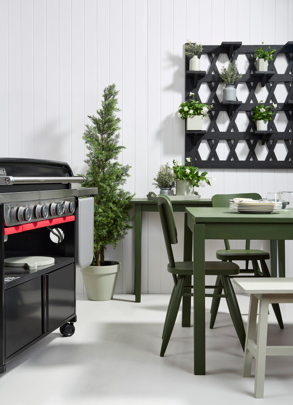 There’s restraint in this design, but not at the cost of personality. If you’re going for practicality and function but still want something that looks great, start with everything you actually ‘need’ first – cooker or BBQ, seating and a table. Simple. Then, add in some décor like plants or a hanging planter, and choose your colour scheme. Here we’ve focused on a simple green and white look, with shades like Resene Olive Green and Lemon Grass paired with Half House White and Off Piste.