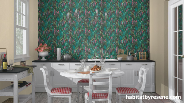 In this quaint dining and kitchen, Resene Curiosity Wallpaper Collection 537635 creates a cosy backdrop with depth and colour.