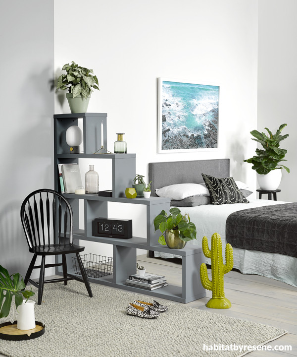 This handy room divider is painted in Resene Steam Roller, left wall in Resene Half Grey Chateau, right wall in Resene Sea Fog, floorboards stained in Resene Colorwood Greywash and clear-coated with Resene Qristal Clearfloor, chair and plant stand in Resene Nero, pot in Resene Organic, cactus and vase in Resene Grass Hopper. Bedlinen from Nest, bed from Freedom, art by Amber Armitage, clock, moccasins, quilt and cushion from Father Rabbit, black tray from Tim Webber. Project by Amber Armitage, image by Wendy Fenwick.