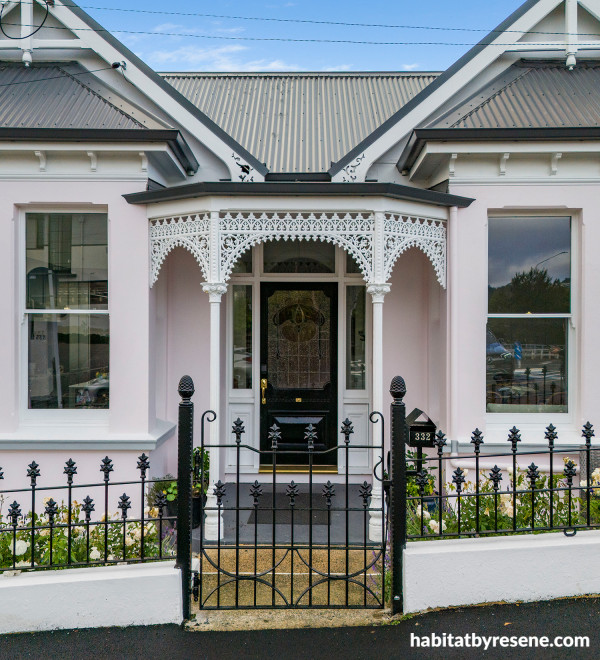 A fancy tipple of pale pink, Resene Sauvignon, adorns this exterior with a contrasting front door and fence painted in Resene Black. The trims, eaves and fretwork are painted in Resene Alabaster. Project by Ahha Architects, painting by Sims & Blue, image by Momentum Agency.
