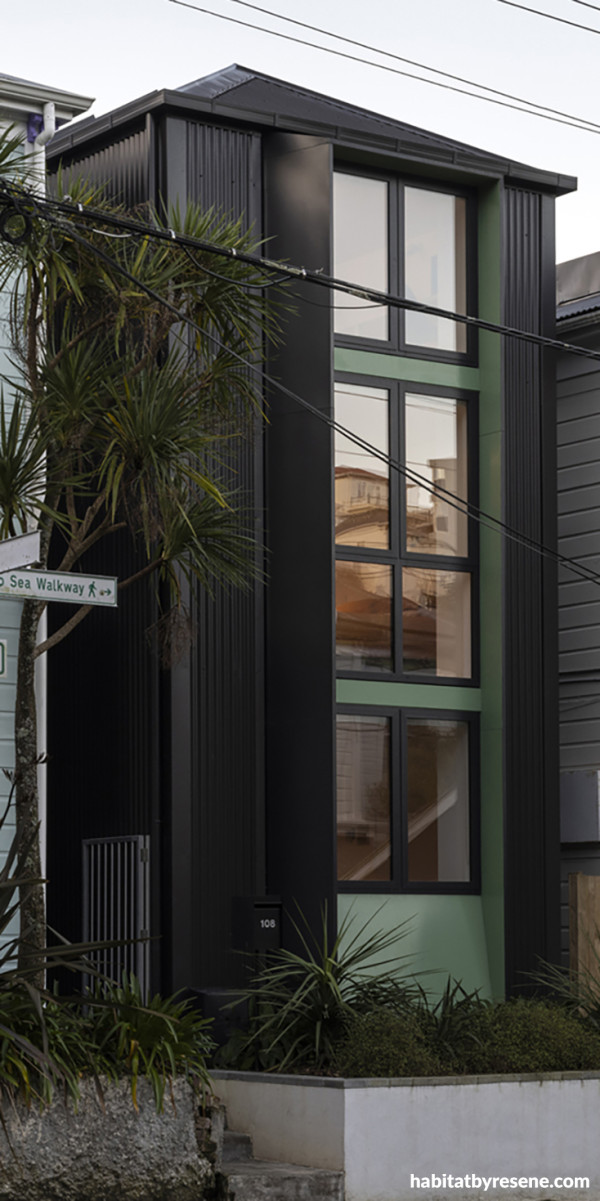This home’s sleek design sets it apart. The three-storey exterior bay window is highlighted using a nostalgic, inviting green, Resene Bach, which contrasts beautifully with the frames and posts in Resene Woodsman Pitch Black. Project by Spacecraft Architects, image by David Straight.