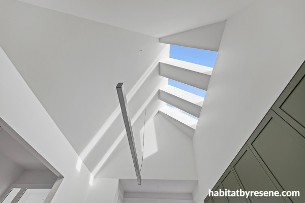 New expansive skylights let the natural light pour in highlighting the home’s detailing and softness of Resene Alabaster and Resene Half Merino.