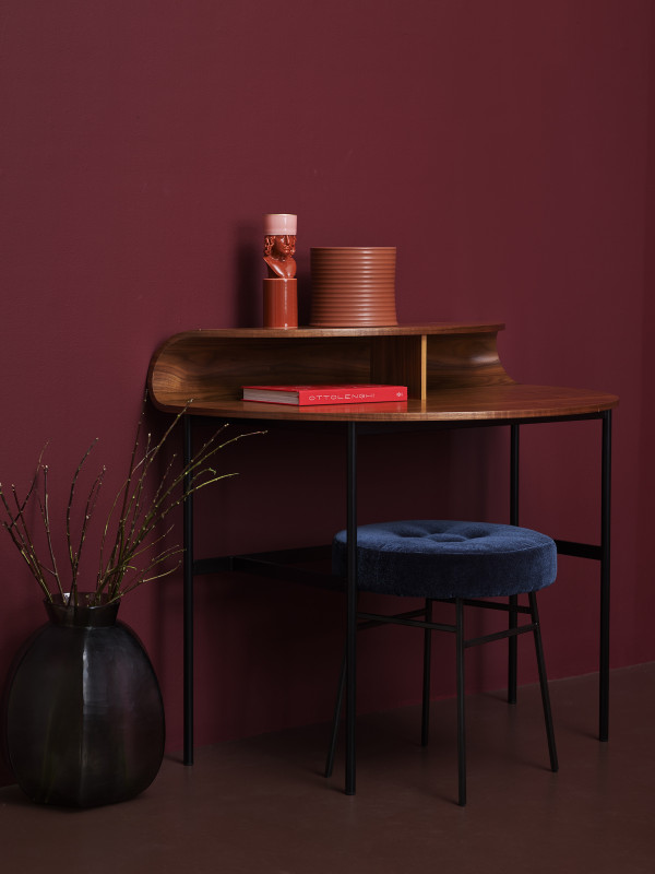 Wall painted in Resene Persian Red, floor in Resene Walk-on in the shade Rebel. Desk and stool from Ligne Roset, floor vase from ECC, candle from Faradays. Project by Amber Armitage, image by Wendy Fenwick.