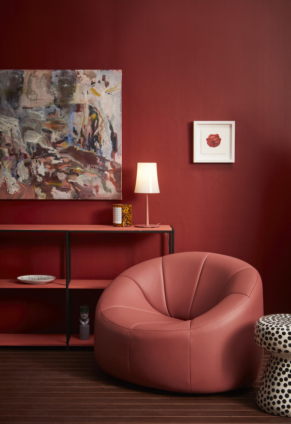 Wall painted in Resene Red Oxide, floor in Resene Colorwood Bark, shelves in Apple Blossom. Chair from Ligne Roset, artwork from Sanderson Gallery, lamp and stool from ECC. Project by Amber Armitage, image by Wendy Fenwick.