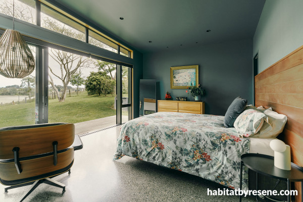 For the master bedroom Jo chose Resene Green Meets Blue – a tone that echoes the ever-changing colour of the Richmond Hills on the other side of the estuary. The ceiling and walls are all the same colour, framing the multiple views of the trees, water and hills.