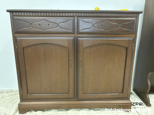 With a contemporary vision in mind, Sarah began the upcycling journey. She was thankful to discover that the piece came apart in two sections, she labelled the hardware and drawers as she took it apart for prep work.
