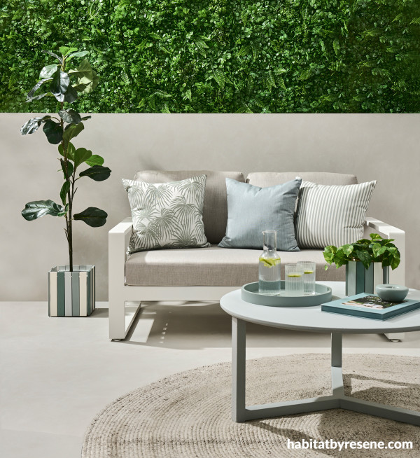 This seat, table and plant pot have been refreshed with new coats of paint. The seat, wall and floor are painted in Resene Triple White Pointer, table in Resene Duck Egg Blue and plant pot in stripes of Resene Thor, Resene Carrara and Resene Inside Back. Rug, seat and cushions from Outside Space. Project by Vanessa Nouwens, image by Bryce Carleton.