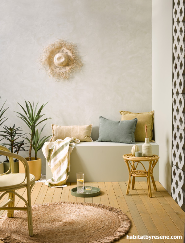 Back wall painted in Resene Aspiring with paint effect in Resene FX Paint Effects medium mixed with Resene Moon Mist. Right wall, breeze blocks and vase painted in Resene Moon Mist, bench seat in Resene Aspiring, deck in Resene Woodsman Decking Oil Stain in Resene Heartwood, table and large plant pot in Resene Teak, tray in Resene Flax and small plant pot in Resene Siam. Project by Vanessa Nouwens, image by Wendy Fenwick.