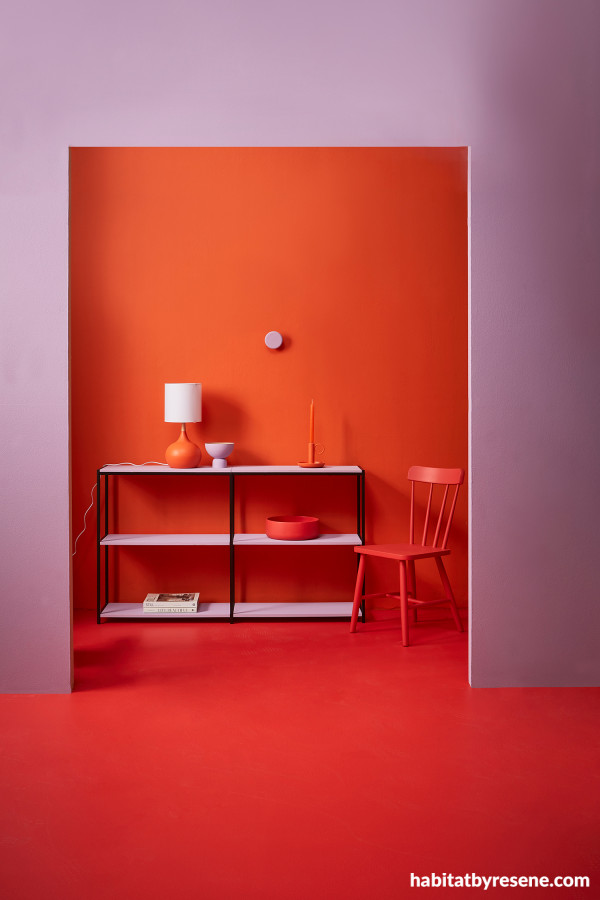 Going all-in on a bold orange with equally colour saturated contrasts creates drama and impact like nothing else. Here, the rear wall, lamp base and candle holder are Resene Tangerine, with chair, floor, and bowl in Whizz Bang. Front wall, shelves, small bowl and hook in Marionette. Project Amber Armitage. Image Wendy Fenwick.