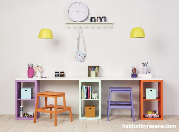 Add bold orange to a colourful palette that adds a moveable layer of fun and creativity to a kids’ zone. Walls in Resene Eighth Bison Hide, floor washed in Colorwood Breathe Easy, hook shelf in Tana, left stool in Sebedee, right stool in Butterfly, cubbies in, from left Wonderland, Fringy Flower, and Grenadier. Lights in Turbo, mason jars in Lola and Drop Dead Gorgeous, cat ornaments in Quarter Tana and Bison Hide, pen pot in Reservoir, storage box in Amulet, storage boxes in Aqua, Wax Flower and Vista Blue. Project Annick Larkin. Image Bryce Carleton.