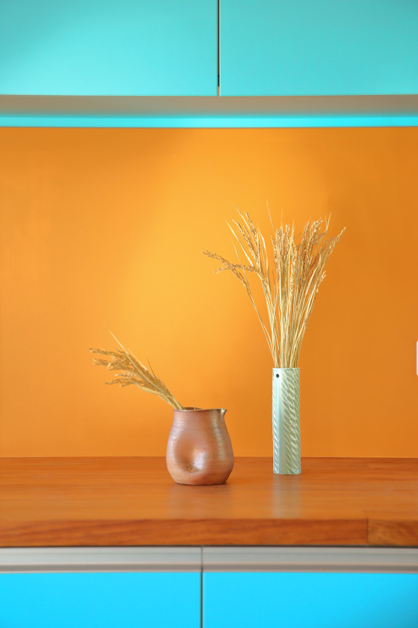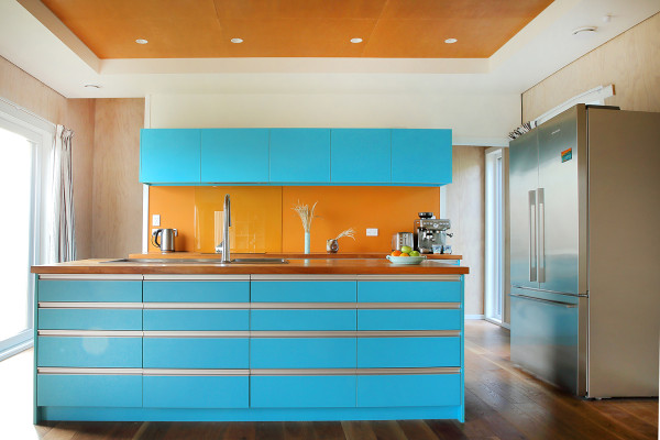 Resene SpaceCote Low Sheen was used for most of the walls for durability and low VOC performance. Inside the open kitchen, dining, and living space, Resene Zylone Sheen was used in the shade Quarter Dutch White to provide contrast to the vibrant kitchen colours.