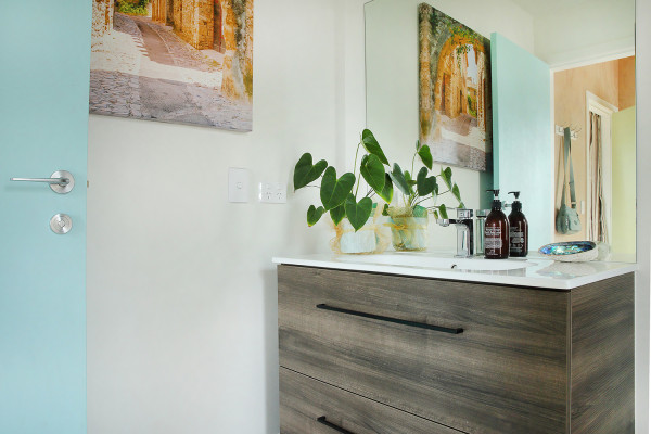 Bathroom walls in Resene Half Rice Cake, doors in Morning Glory.