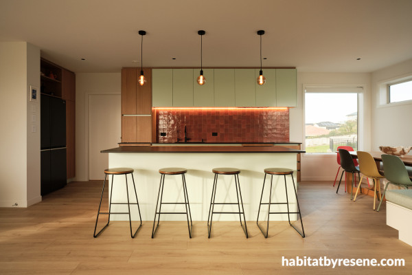 “The kitchen is the backdrop for the open plan living and entertaining area of the home, looking out towards the sea and sun, so we chose to use Resene Edgewater for some of the kitchen cabinets.
