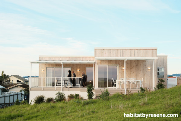 A modern take on the Kiwi bach was what the owners of this Whakatane home, featuring timber cladding punctuated by trim in Resene Titania, were looking for.