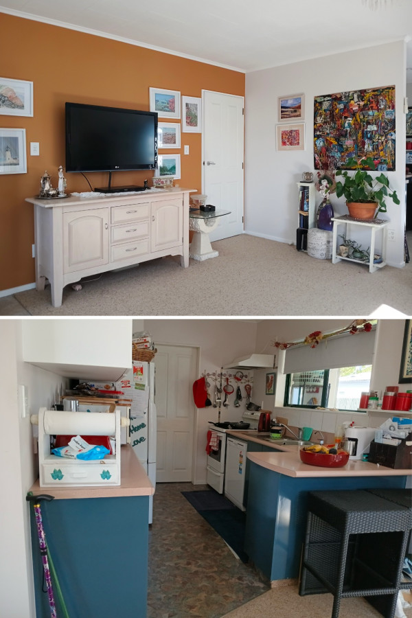 Charmaine’s home has had a lovely transformation with the help of her family. “I'm heading further of 83 years,” she says. “About a year ago 31 members of my family, including my 6 children, spent a long weekend here and refurbished my living area. It looks amazing.” Her house now has pops of colour with Resene Dark Buff in the living room, Navigate on the kitchen cabinetry and White on the ceiling.