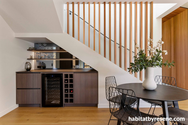 The kitchen space is defined by a striking painted feature in Resene Double Truffle with walls in Resene Rice Cake and ceiling in Resene Quarter Rice Cake. Libra Pendant from Desejo.