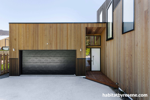Front door in Resene Quarter Rice Cake. To get this timber look, use Resene Woodsman Natural Wood Oil in shades Resene Limed Oak (light), Resene Bushtrack (dark) and Resene Pitch Black (garage door).