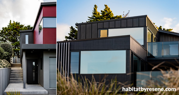 For a light, coastal-inspired home, try Resene Black White on weatherboards or trims, with a colour block of Bali Hai on vertical cladding or on the front door, and Woodsman Driftwood on any timber features like posts, cladding or decking: