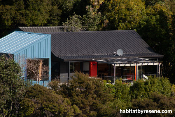 This Kuaotunu exterior features the bright Resene Clockwork Orange on the extended living space, with contrasting All Black and the breezy blue of Azure on COLORSTEEL®. Using darker and cooler tones alongside a confident colour, like the iconic Clockwork Orange, helps ground the overall look, giving the eye somewhere to rest while still letting the bold hue shine. It’s a great example of how strong exterior colours work best when they’re paired with calmer companions, creating contrast, depth and a finish that feels deliberate rather than loud.