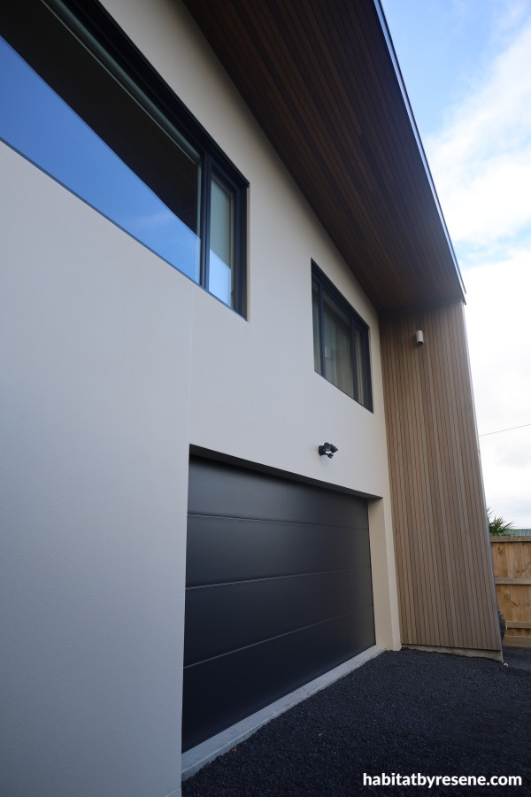 Exterior is cladded in a Resene Construction Systems / ROCKCOTE system coloured to Resene Fossil. Deck stained in Woodsman Decking Stain in Equilibrium.