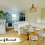 The heart of the home is the living space. “This area does so much,” Michelle says. And zones are very carefully considered. “We created zones for resting, viewing, working, relaxing, cooking and eating.” The cohesion is intentional and detailed, from white oak cabinetry and brushed nickel handles to sage green melamine, blush pink shelving and textiles that quietly mirror each other across the room.