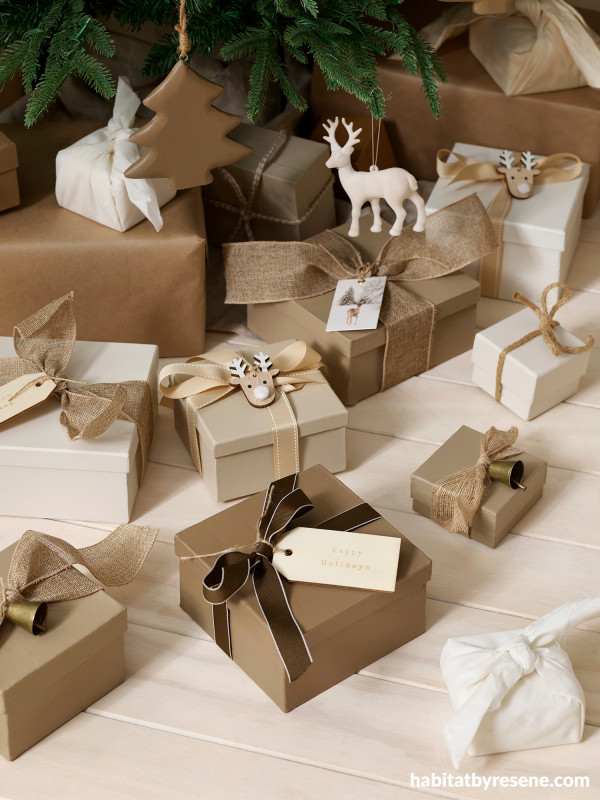 For presents, we reused some old boxes, as well as buying a few from a craft store, and painted them in Resene Drought, Resene Cement, Resene Tobacco Brown, Resene Double Drought, Resene Half Drought and Resene Half Blanc. These shades all tie back into the natural, rustic theme and blend in with the room’s design. Ribbons and tags were added along with decorative elements such as wooden reindeers and bells for an extra festive touch.