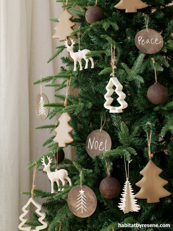 One of the most fun parts of the lead up to Christmas is getting to decorate your Christmas tree! This tree has a mix of store bought, painted and DIY decorations. Remember when dressing a tree, it’s a great idea to mix shapes of the decorations for added interest and depth. These charming wooden baubles are stained in Resene Colorwood English Walnut, while the cut-out tree decorations are painted in Resene Eighth Drought. The large flat tree decorations are painted in Resene Tobacco Brown, and we also made some round flat decorations by repurposing some ply coasters. We stained the coasters in Resene Colorwood English Walnut then using a fine paintbrush painted tree and word designs onto them in Resene Eighth Drought.