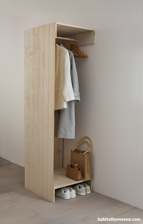 Make a fabulously functional first impression with a streamlined entranceway wardrobe. For a soft, cohesive look, we’ve colour washed the timber in Resene Colorwood Breathe Easy, keeping the palette calm, but you can paint yours in whatever colour you like, or match your existing wall colour. Click here to make your own entryway wall-drobe.